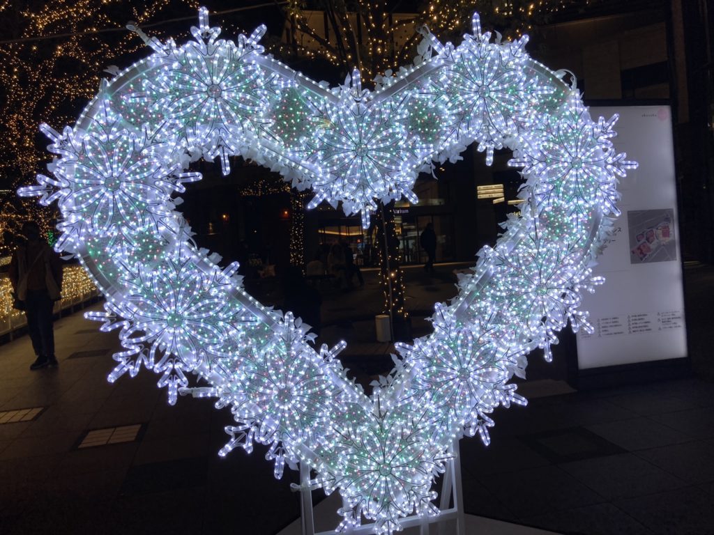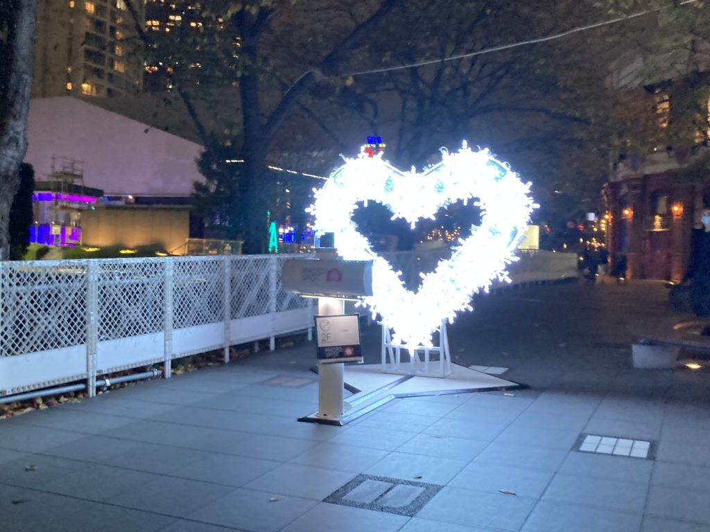 Bizタワー横、TBSショップの前にハートイルミネーションの撮影スポットがある。